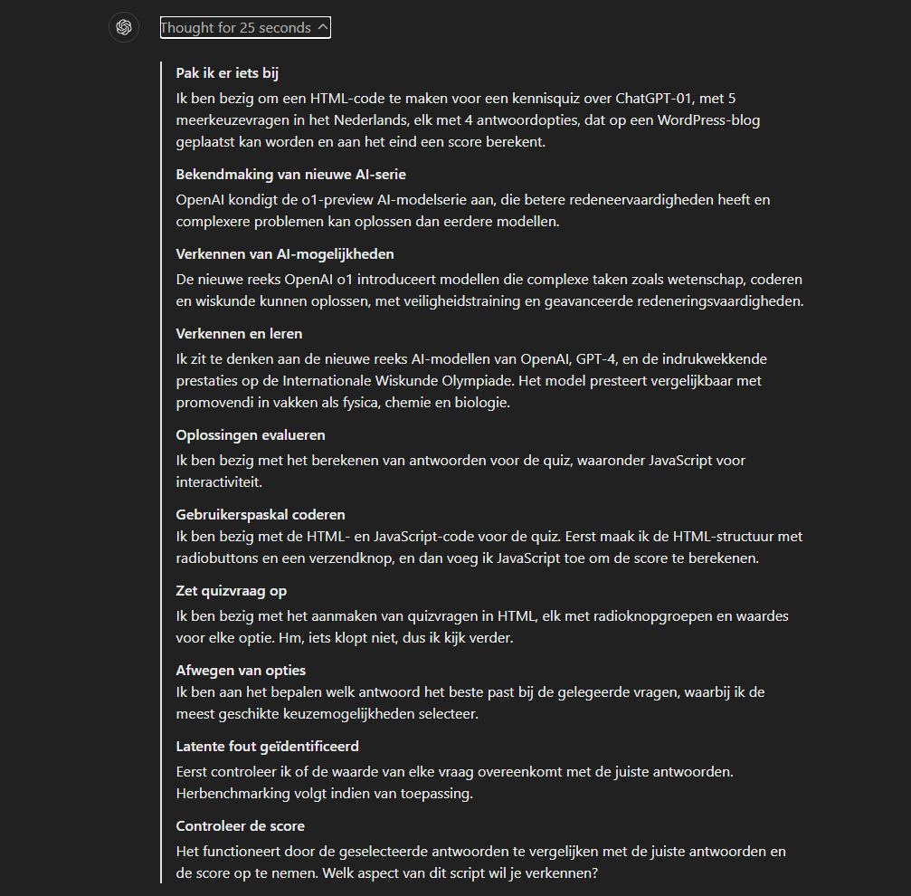 Vervolgens ging ChatGPT 25 seconden nadenken. Je merkt dan meteen dat de focus niet direct op snelheid ligt, maar dat AI echt de tijd neemt om het probleem aan te pakken.