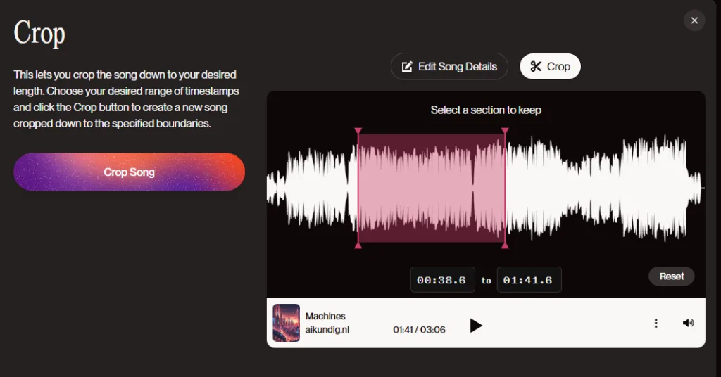 Met de Crop Songs-functie kun je een gedeelte van je song behouden en de rest verwijderen. Dit is vooral handig wanneer je een specifiek deel van je creatie wilt gebruiken zonder het hele nummer te hoeven herschrijven. Bijvoorbeeld, als je alleen het refrein of een deel van een couplet wilt overhouden, kun je dat met deze functie snel en eenvoudig doen.