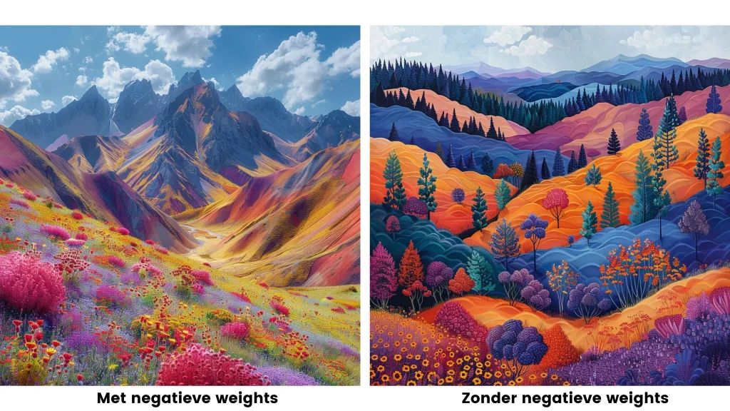 Wil je juist dat een aantal dingen niet op de afbeelding komen, dan kan je dit aangeven met negatieve prompt weights. Een voorbeeld: