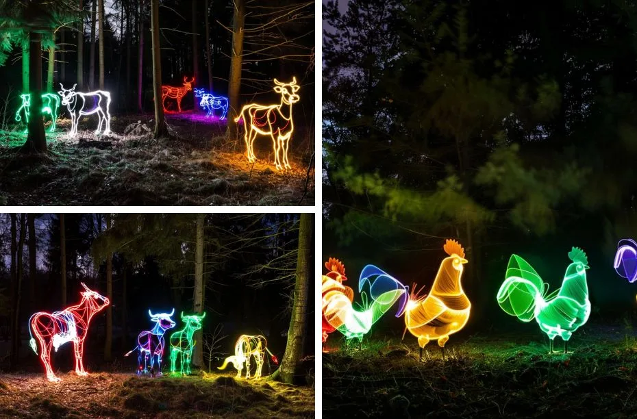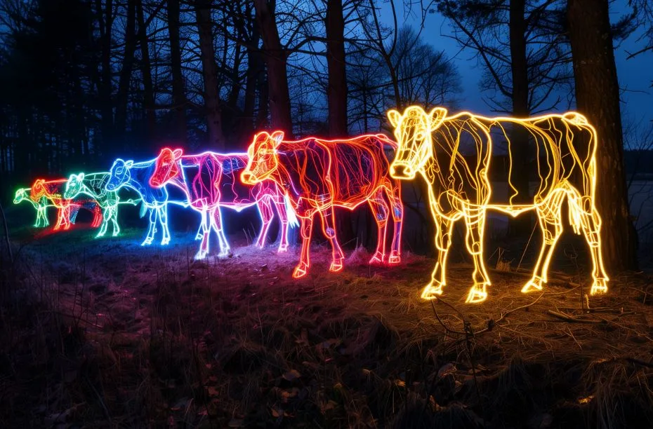 Lightpainting a group of colorful light cows, at night in the forest --ar 4:3 --style raw --stylize 0Lightpainting met staalwol