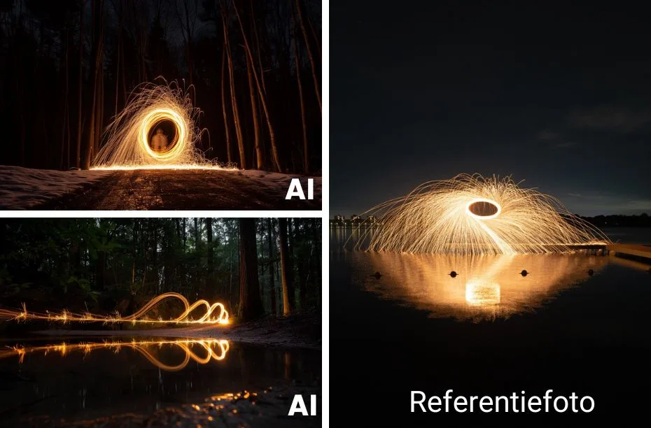 Dit is persoonlijk een van mijn favoriete manieren om te lightpainten. Je vult een garde, die aan een stevig stuk touw vastzit, met staalwol en steekt dit aan met een 9 volt batterij. Vervolgens slinger je dit hard in het rond om prachtige effecten te creëren. Je hebt hier wel een flinke dosis lef voor nodig, dat zegt zelfs Kamera Express 😉. Ik heb voor de prompts, gemaakt in Midjourney, wel een reference image opgegeven, die ik zelf heb gemaakt met mijn camera (dus niet met AI).