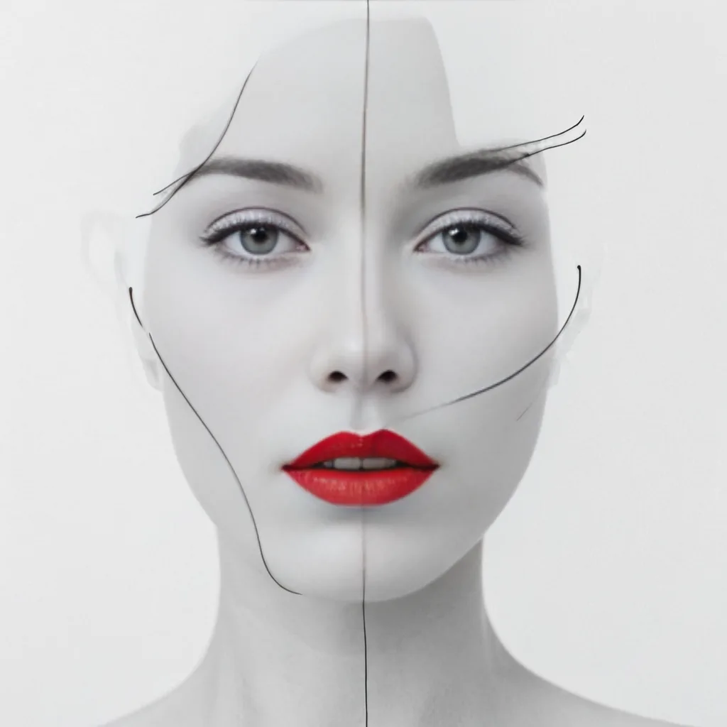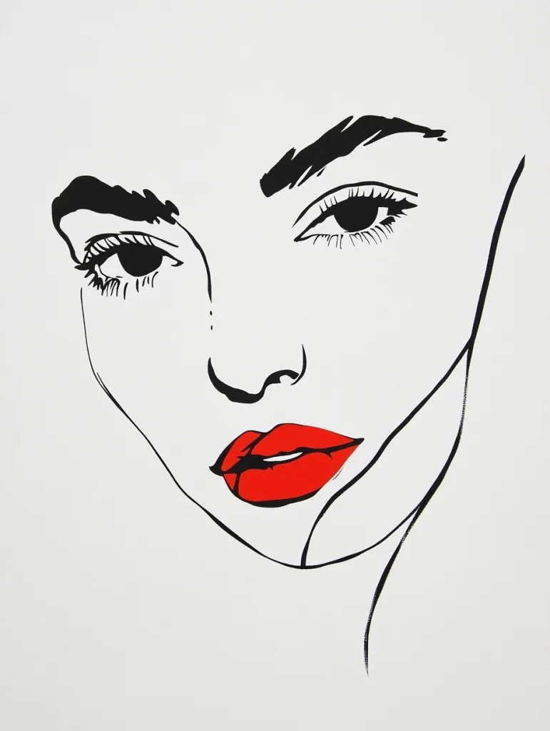 - A minimalist portrait of a face in black and white, with clean lines outlining the features, and a single red accent for the lips, against a white background