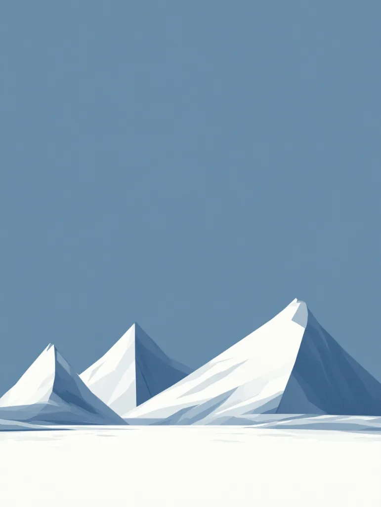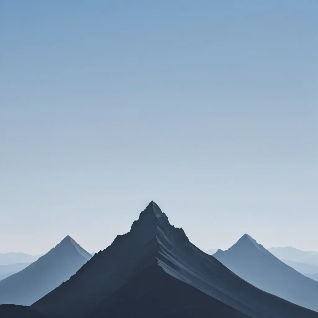 - A minimalist mountain landscape with simple triangular peaks, a straight horizon line, and a solid blue sky, in a monochromatic color scheme.