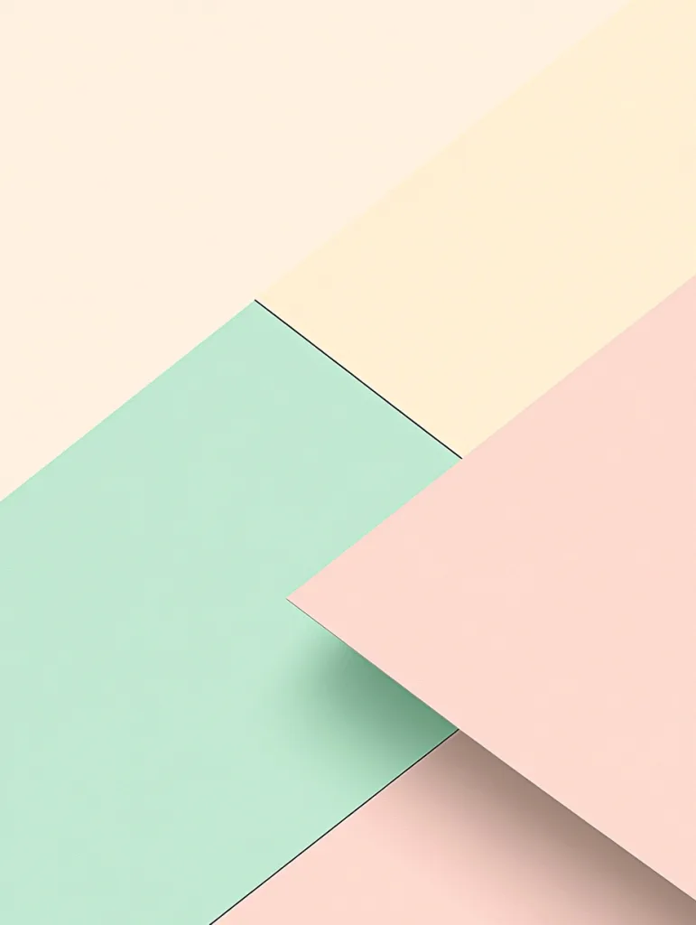 - A minimalist design using only three shades of pastel colors: soft pink, mint green, and light yellow, in simple overlapping rectangles.