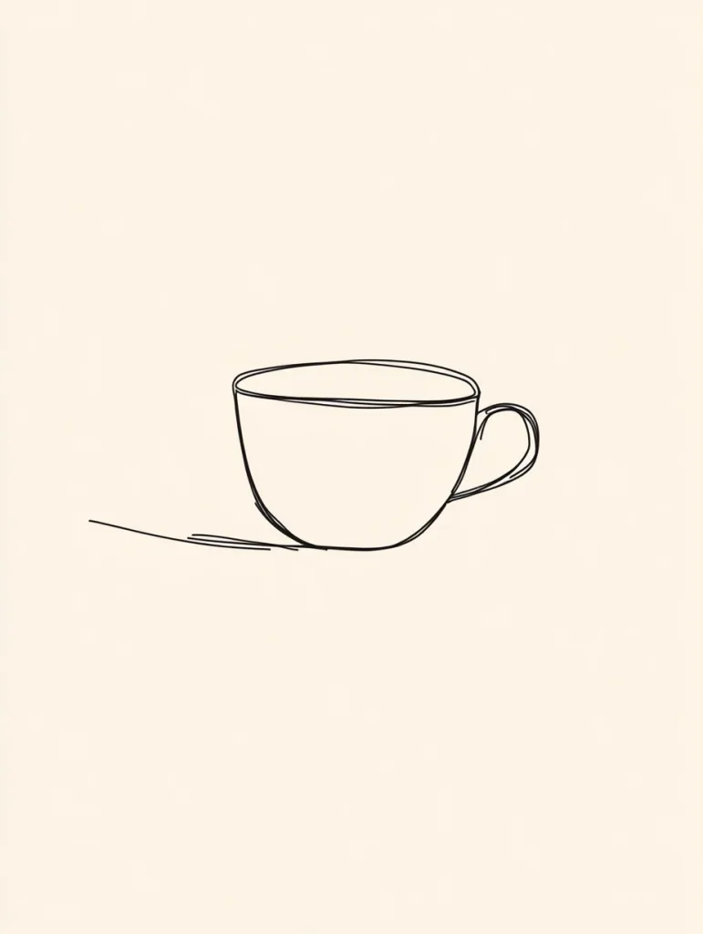- A minimalist illustration of a coffee cup drawn with a single black line, placed on a white background, with no additional details.