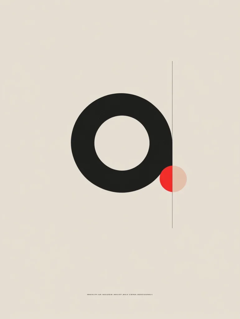 - A minimalist typographic poster featuring the letter ‘O’ in a modern sans-serif font, with a single red dot.