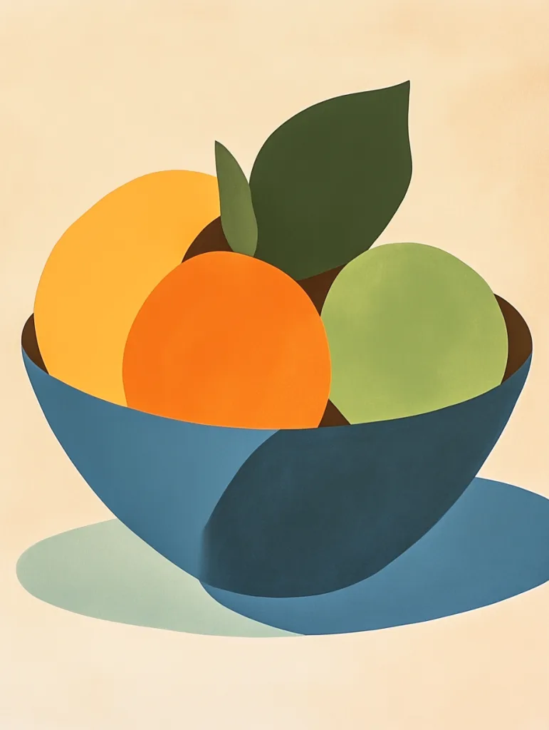 - A still life of a bowl of fruit represented as simple geometric shapes, with only three flat colors: orange, green, and blue
