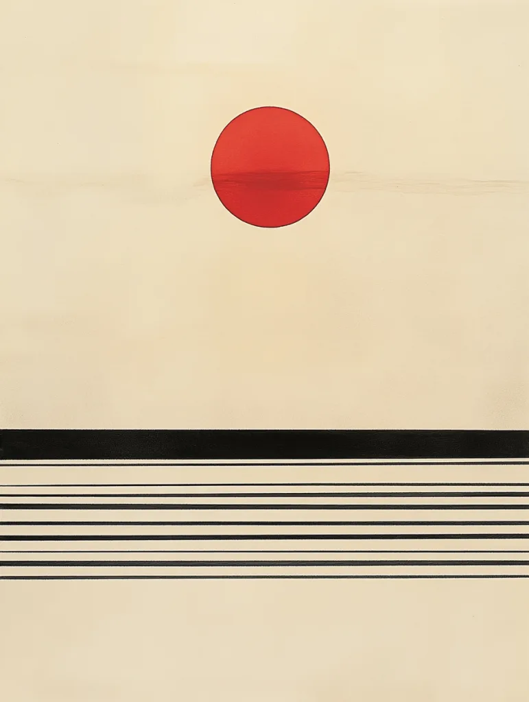 - A wide horizontal landscape featuring three thin parallel lines representing the ground, horizon, and sky, with a small red circle as the sun
