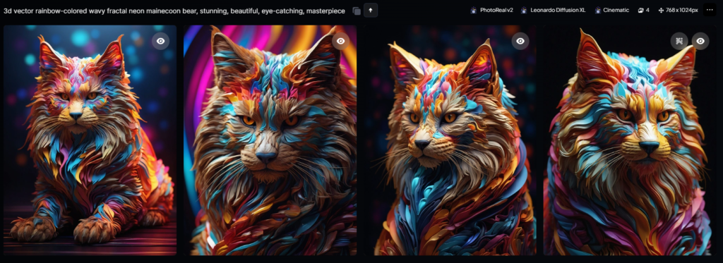 Bij systemen zoals Midjourney of Stable Diffusion begin je vrijwel altijd met genereren van meerdere afbeeldingsopties op basis van een tekstuele beschrijving (een prompt) die je invoert. Deze initiële beelden zijn vaak van een standaardresolutie, omdat deze sneller te genereren zijn dan afbeeldingen van een hele hoge resolutie. Uit de eerste prompt krijg je vaak vier of meerdere opties om uit te kiezen, zoals hieronder bij Leonardo AI. Ik heb hier de volgende prompt gebruikt, in de Photoreal, Cinematic modus: